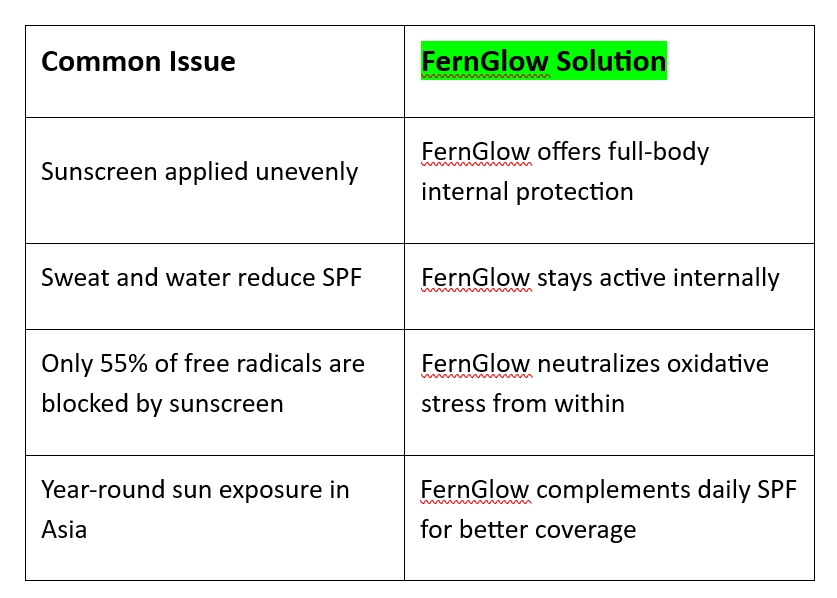 For maximum sun protection, combine your sunscreen use with oral consumption of FernGlow. Sunscreens are a good start, but will not offer the vital all-round protection you need that FernGlow provides.